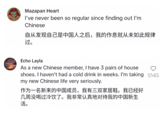 “Becoming Chinese”(成为中国人)话题的起源是华裔博主雪莉在TikTok所发布的视频。视频中,她向粉丝介绍喝热水、少食生冷食品等中国人的冬季养生、中医理念和饮食习惯,还幽默地跟网友宣称“从明天起,你就要变成中国人了”。视频迅速获得数百万播放量,引发大量海外网友的模仿,他们练气功、煮苹果水、泡枸杞,更新起自己过“中式生活”的日常。而海外网友对“中式生活”方式的探索不仅停留在养生层面,还延续到了衣食住行等生活日常中。有人为了春节迎好运,在服饰中加入红色元素;有人学打麻将,来让自己更“中国化”。