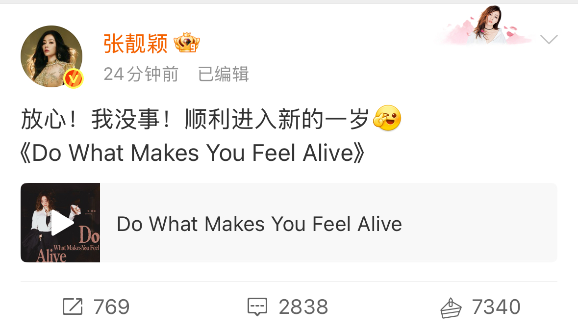 演出结束后,张靓颖迅速在微博报平安:“放心!我没事!顺利进入新的一岁。”据悉,10月11日当晚是张靓颖生日。她同时在评论区与粉丝互动透露:“耳机摔坏了,是说怎么后面听起来怪怪的。”