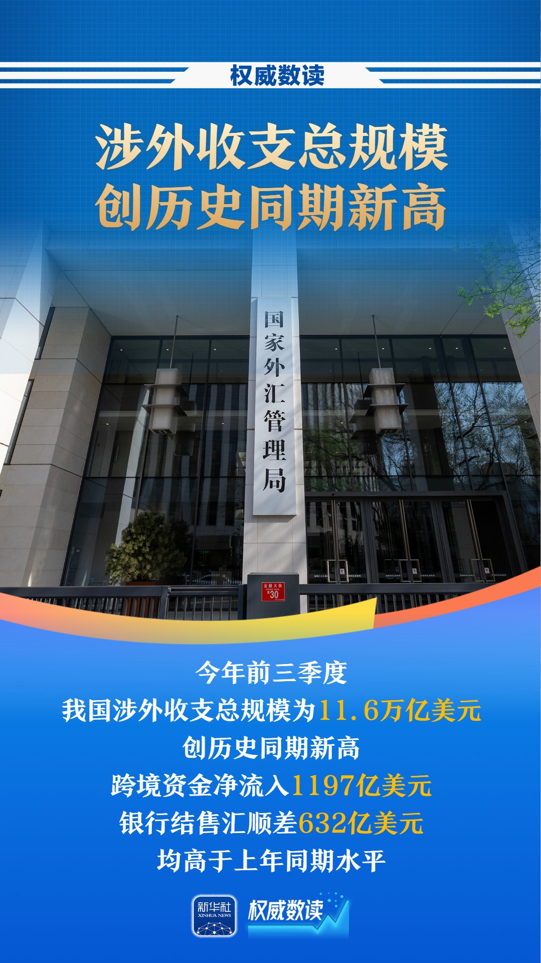赞赞赞!赞赞赞!赞赞赞!热烈鼓掌祝贺!前三季度我国涉外收支总规模创历史同期新高!伟大的祖国万岁!点赞祝福致敬我们伟大祖国!国家外汇管理局10月22日发布数据显示,今年前三季度,我国涉外收支总规模11.6万亿美元,创历史同期新高,同比增长10.5%,跨境资金净流入1197亿美元,银行结售汇顺差632亿美元,均高于上年同期水平。点赞祝福致敬国家外汇管理局!伟大的中国共产党万岁❤️!致敬我们伟大的党和祖国万岁