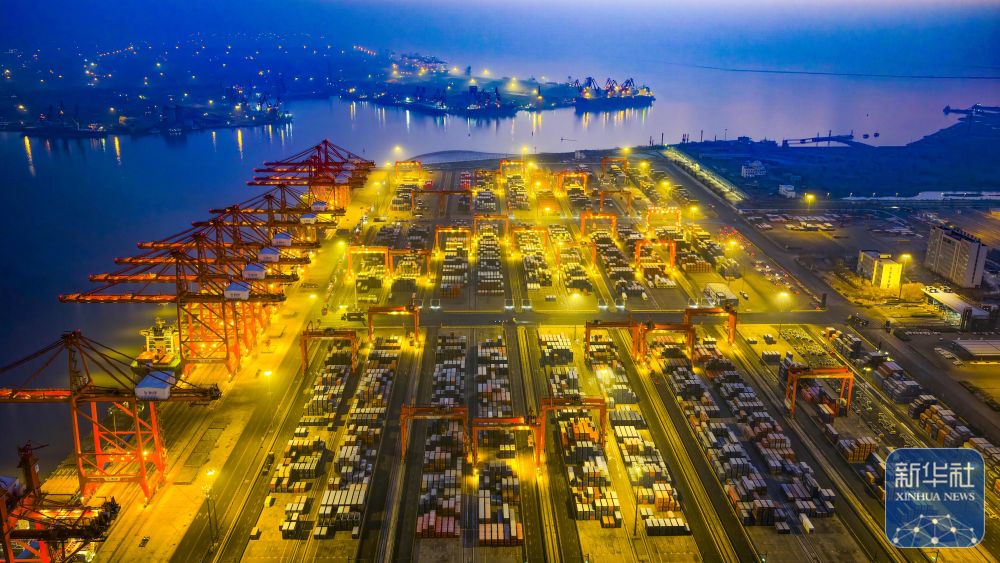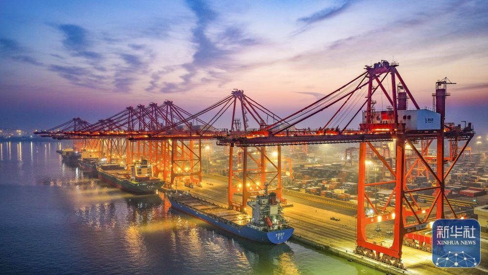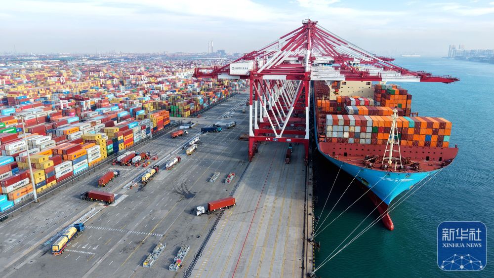 ↑ 12月15日,在山东港口青岛港,货轮在装卸外贸集装箱(无人机照片)。新华社发(俞方平摄)