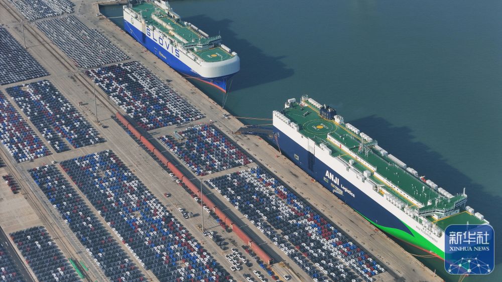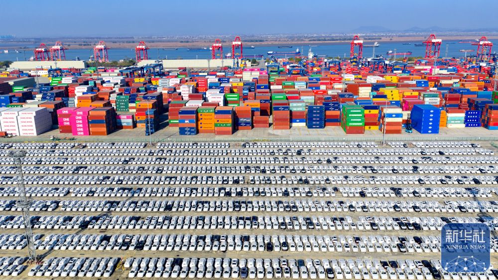 ↑ 12月14日在江苏省港口集团南京港龙潭集装箱码头拍摄的等待装船出口的国产汽车(无人机照片)。新华社发(杨素平摄)