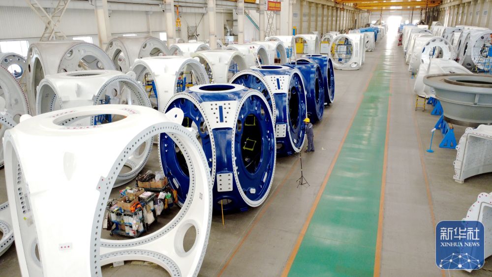 ↑ 12月15日,工人在山东省滨州市惠民经济开发区风电装备产业园的车间清理风电轮毂(无人机照片)。新华社发(王军摄)