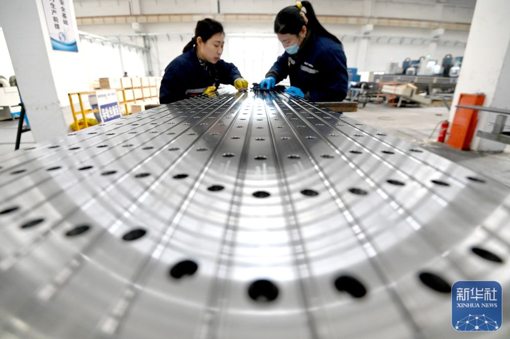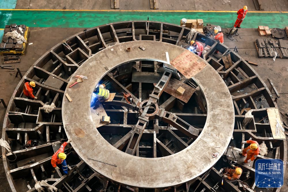 ↑ 12月15日,在位于江苏省江都高新技术产业开发区的江苏广泓重工设备有限公司,工人在顶管机总装车间作业。新华社发(任飞摄)