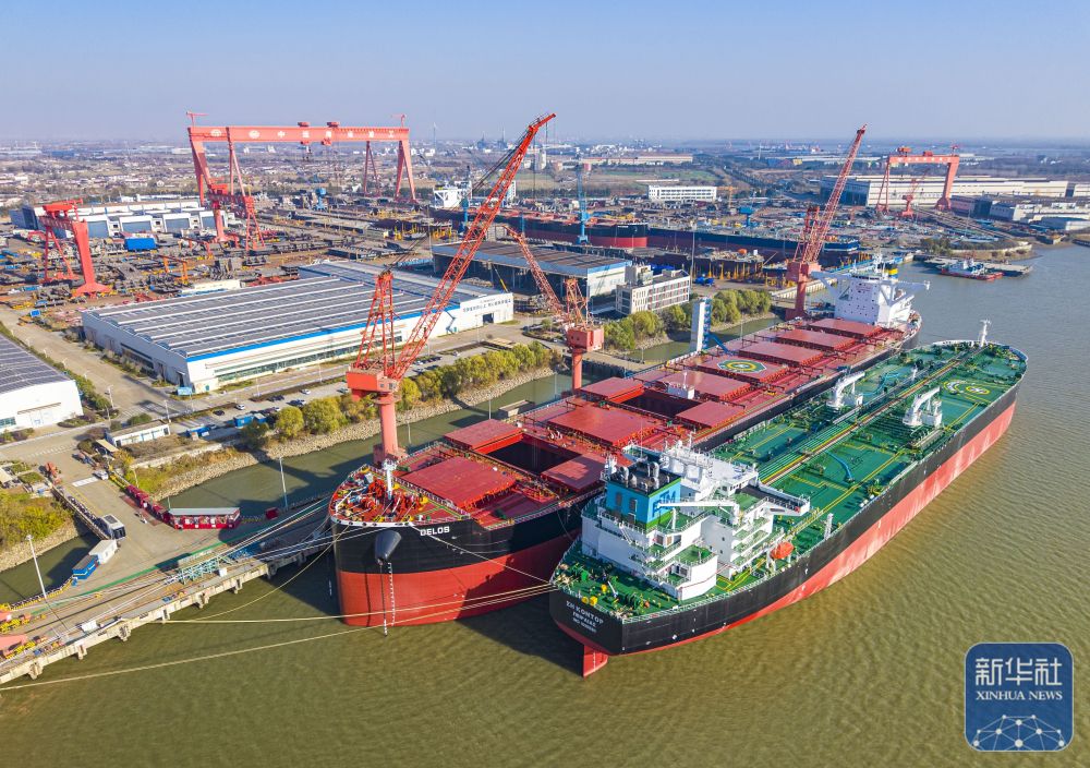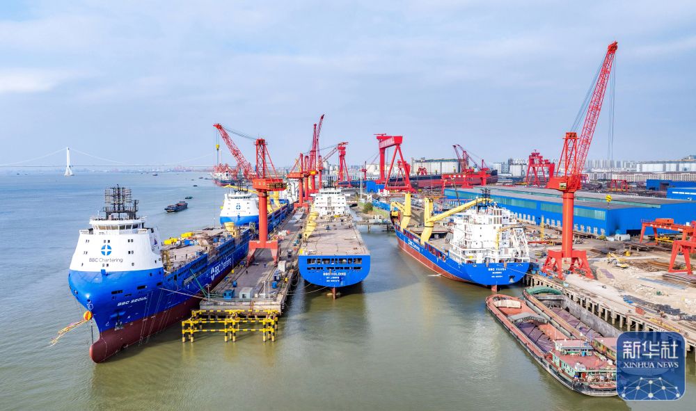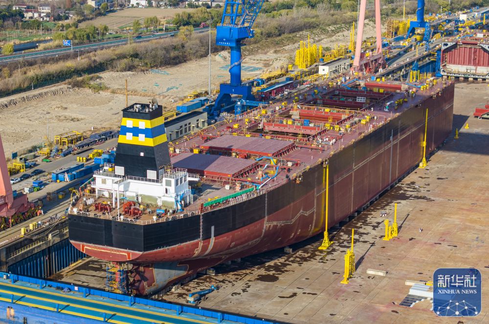 ↑ 12月15日,在江苏南京招商工业南京金陵船厂生产厂区,大型船舶在建造中(无人机照片)。新华社发(辛一摄)
