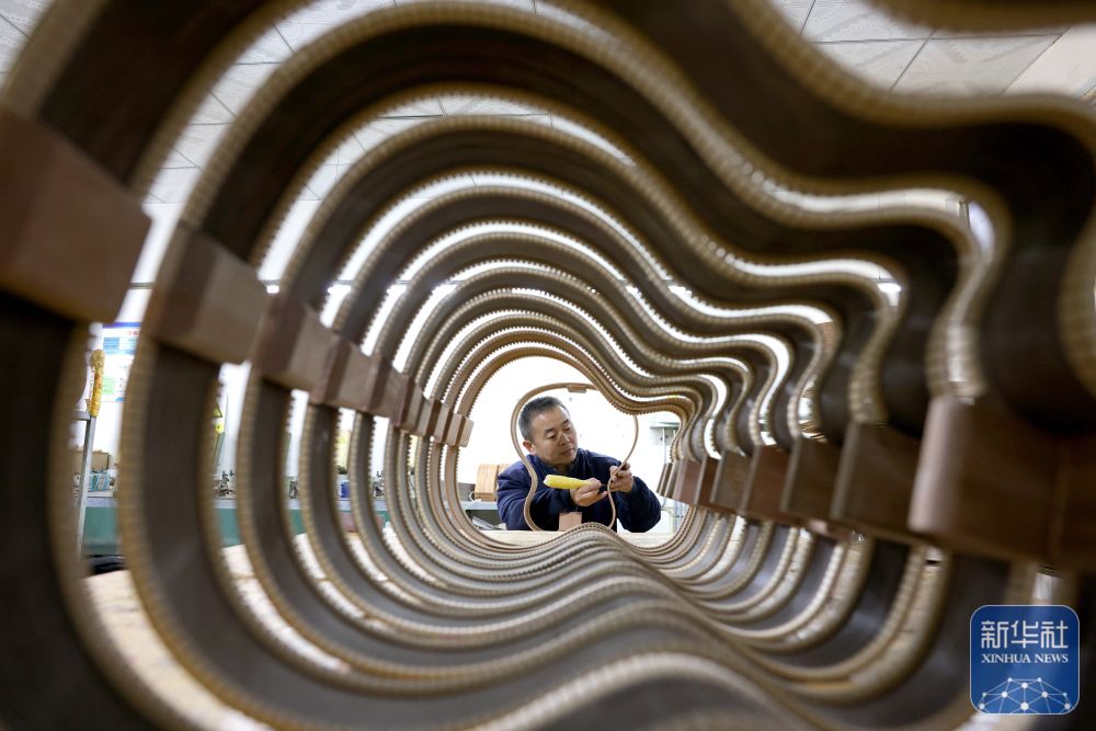↑ 12月15日,在山东省枣庄市市中区孟庄镇一家吉他生产企业,技术工人在生产吉他。新华社发(孙中喆摄)