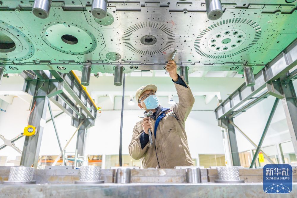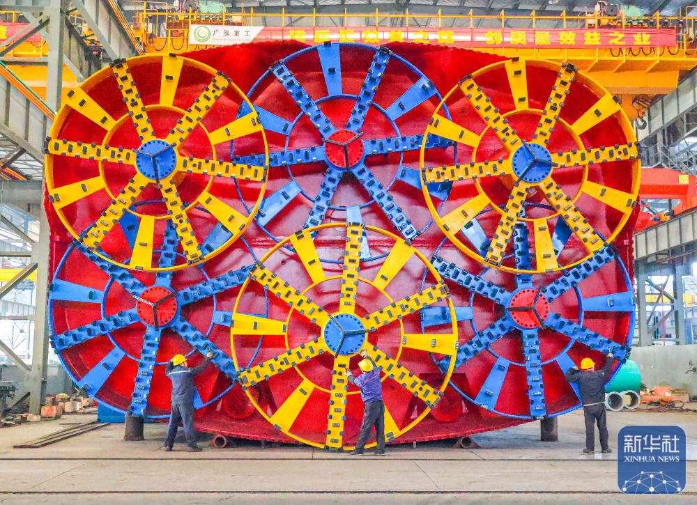 ↑ 12月15日,中铁科工集团武汉江夏制造基地技术工人对盾构机配件进行装配作业。新华社发(赵军摄)