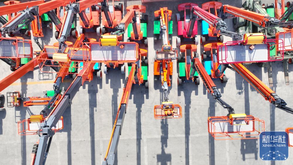 ↑ 12月15日,在位于浙江省湖州市德清县雷甸镇的浙江鼎力机械股份有限公司,工人对准备出口的新臂式智能高空作业平台设备进行检测(无人机照片)。新华社发(谢尚国摄)