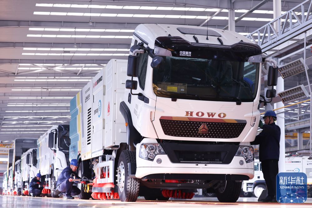↑ 12月15日,在河北省石家庄市的冀中装备石煤机公司,工人在组装新能源环卫车。新华社发(梁子栋摄)