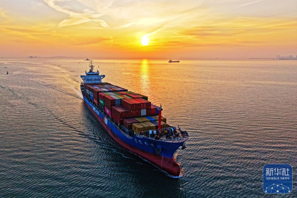 ↑ 12月15日,一艘集装箱货轮驶入山东港口烟台港(无人机照片)。新华社发(孙文潭摄)