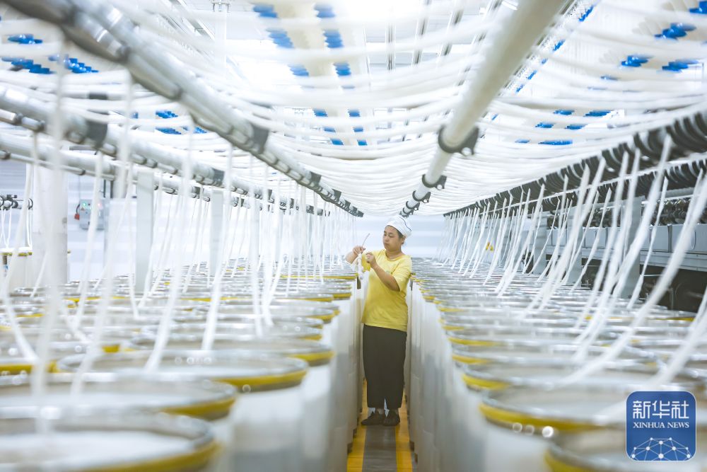 ↑ 12月15日,工人在江苏省泰州市姜堰区三水街道江苏泰达纺织科技有限公司智慧纺纱车间忙碌作业。新华社发(顾继红摄)