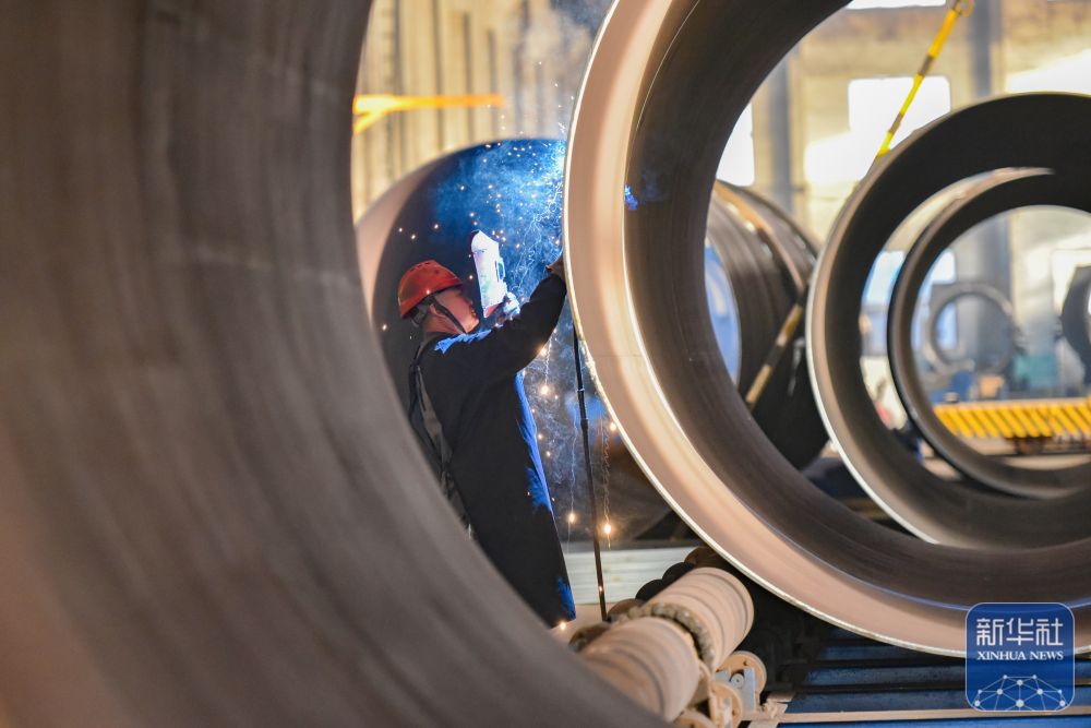 ↑ 12月15日,在山东省青州市益都街道一家大型风电设备制造企业,工人在车间内进行焊接作业。新华社发(王继林摄)