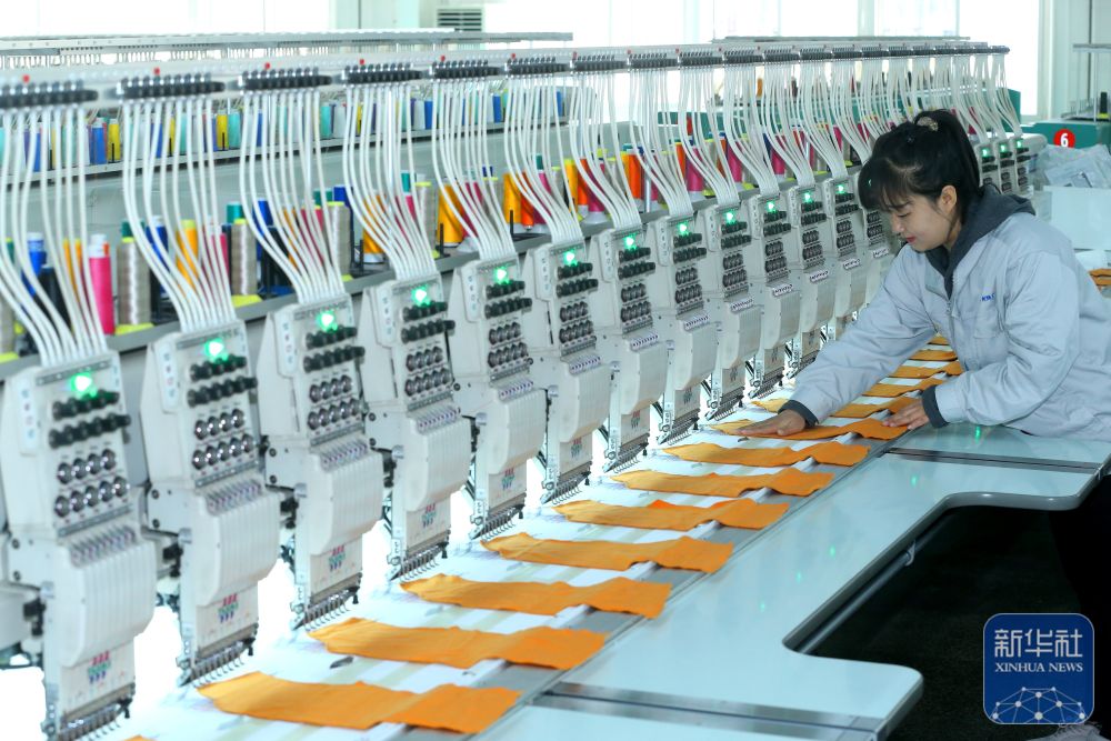 ↑ 12月15日,山东省青岛市即墨区即发集团员工在生产服装绣花产品。新华社发(梁孝鹏摄)