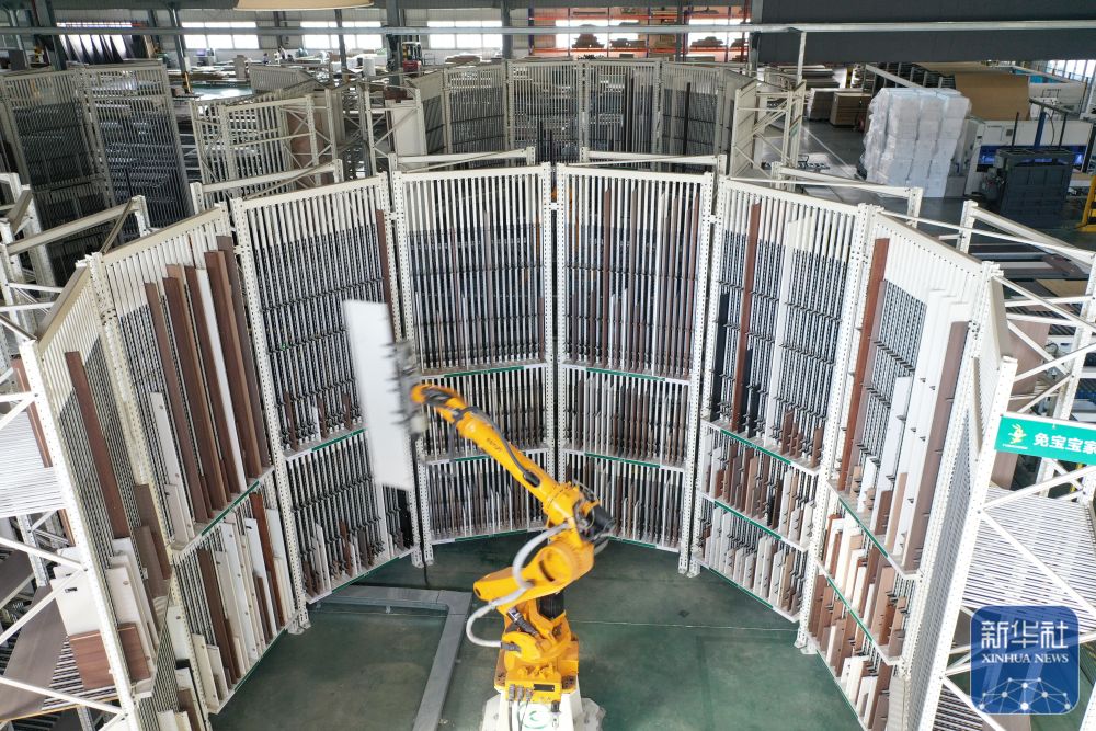 ↑ 12月15日,在位于浙江省湖州市德清县乾元镇的德华兔宝宝装饰新材股份有限公司家居产业园,智能分拣机械臂在分拣家具板材(无人机照片)。新华社发(倪立芳摄)