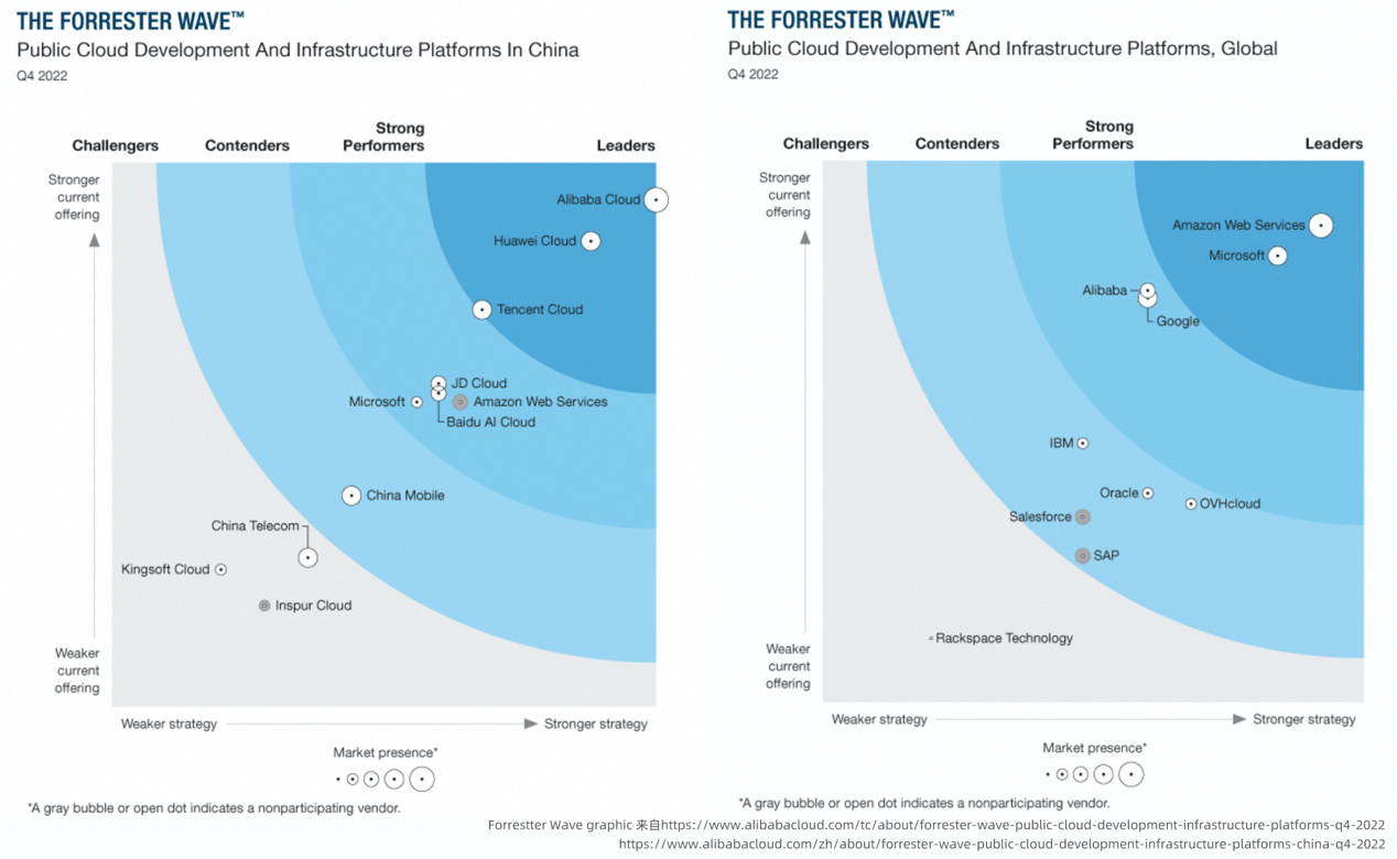 近日,国际研究咨询机构Forrester发布2022年Q4全球和中国云计算市场Forrester Wave报告,对中国主流公有云厂商进行全面评估。报告显示,中国市场中共有11家企业入选,其中阿里云、华为云、腾讯云位居领导者象限,京东云公有云产品和百度AI智能云紧随其后,居于强劲表现者象限。