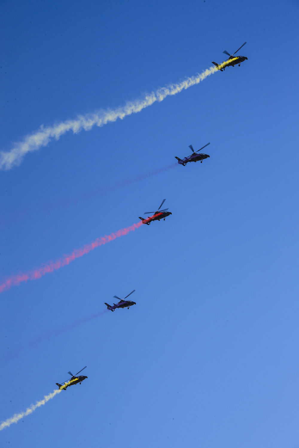 ↑9月14日,在第六届中国天津国际直升机博览会开幕式上,陆军“风雷”飞行表演队进行通场飞行表演。新华社记者 张永进 摄