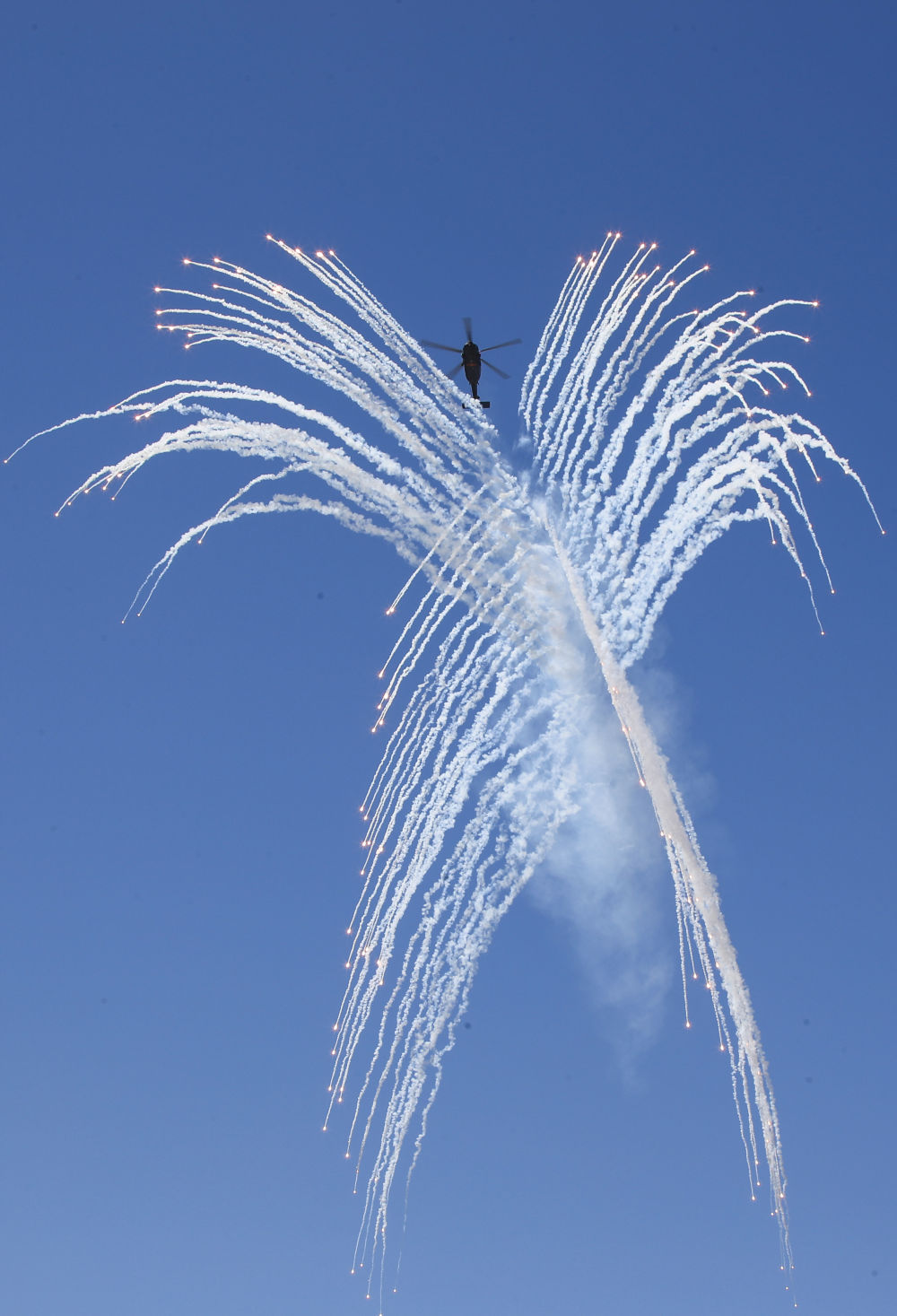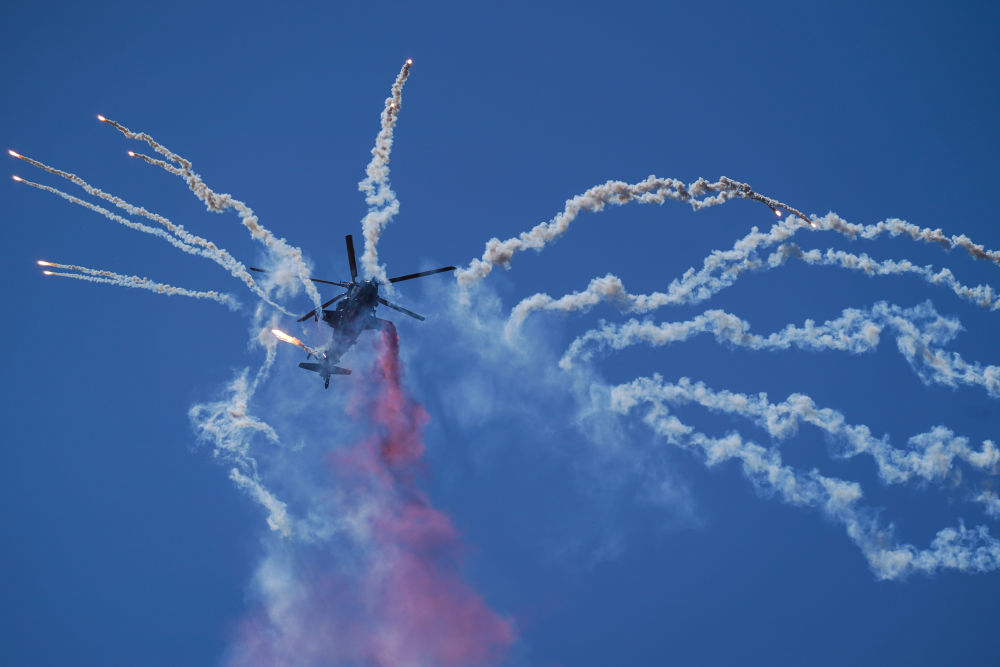↑9月14日,在第六届中国天津国际直升机博览会开幕式上,陆军“风雷”飞行表演队直-10武装直升机发射干扰弹。新华社发(陈凯 摄)
