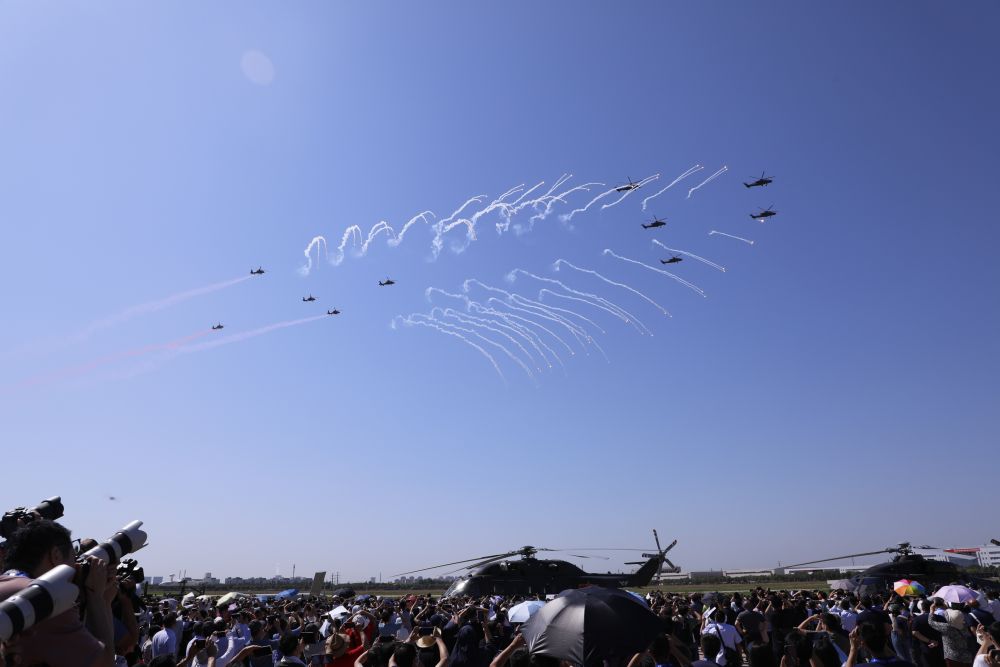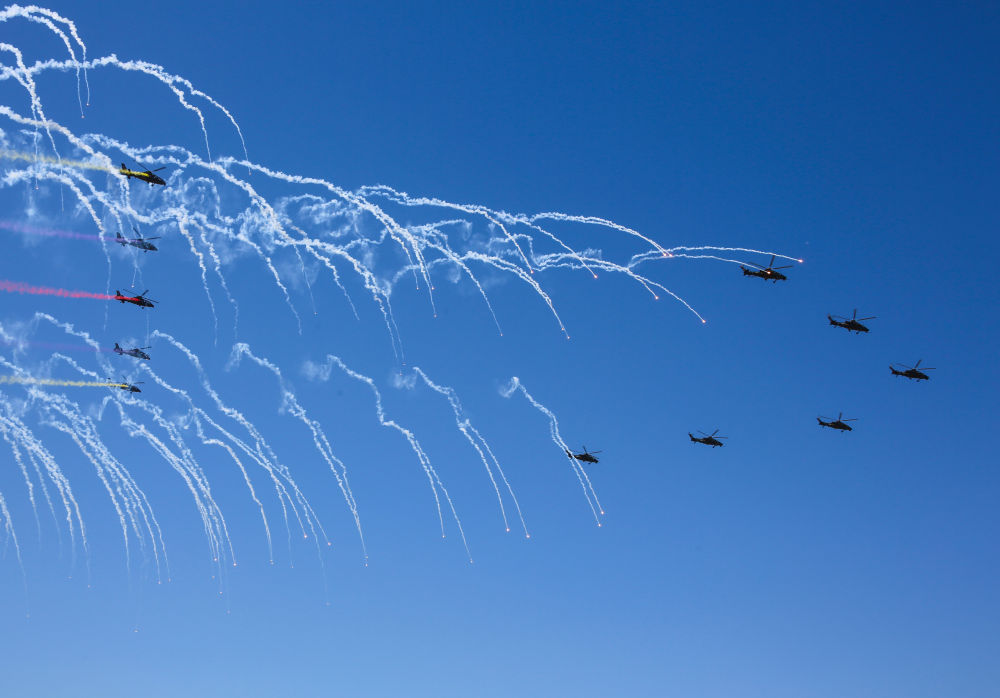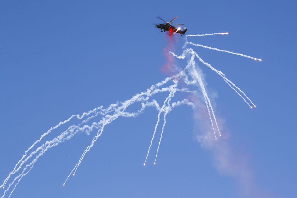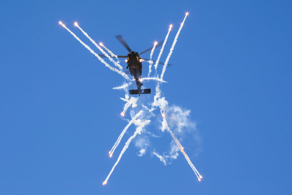 ↑9月14日,在第六届中国天津国际直升机博览会开幕式上,陆军“风雷”飞行表演队直-10武装直升机发射干扰弹。新华社记者 张永进 摄