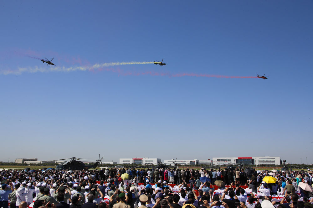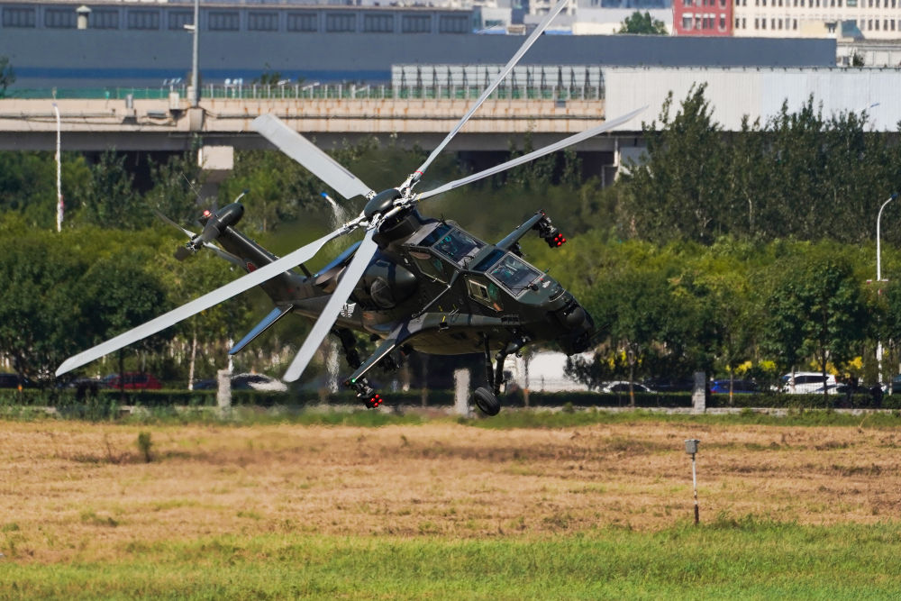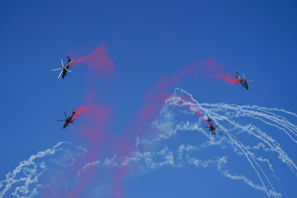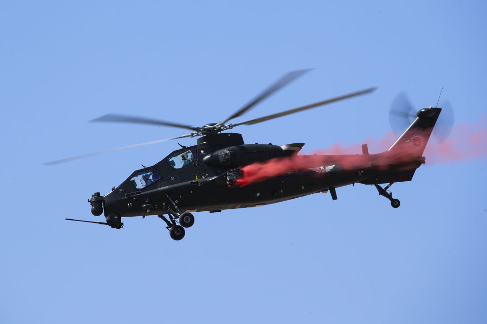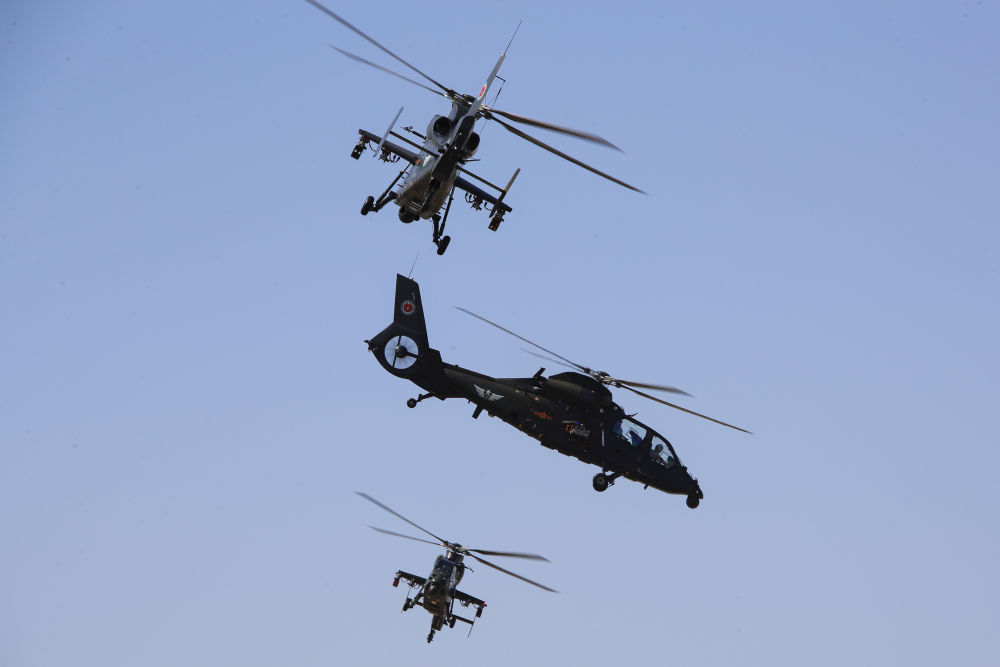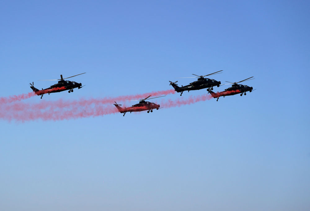 ↑9月14日,在第六届中国天津国际直升机博览会开幕式上,陆军“风雷”飞行表演队直-10武装直升机进行飞行表演。新华社发(陈凯 摄)