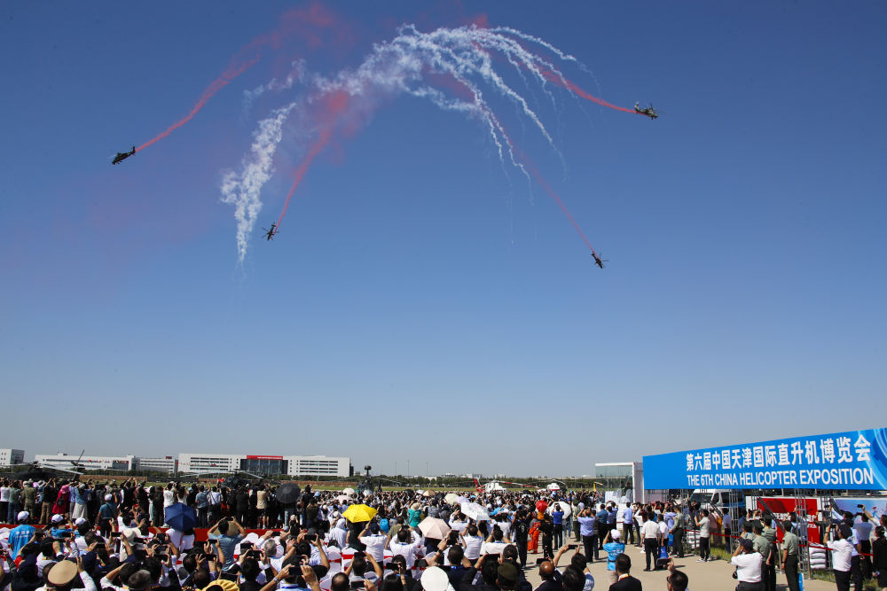 当日,第六届中国天津国际直升机博览会在天津市空港经济区开幕。陆军“风雷”飞行表演队在开幕式上进行飞行表演,先后向观众演示三机芭蕾、尾追螺旋、四机开花等8个课目的特技飞行动作,展示了陆军航空兵部队转型建设和实战化训练成效。