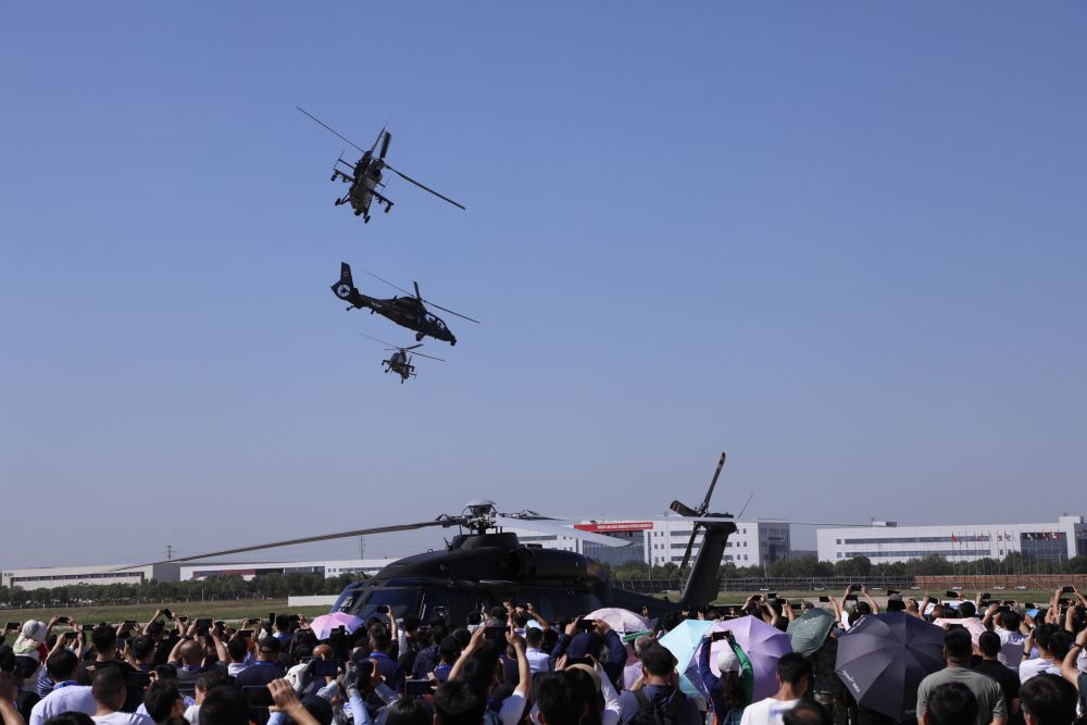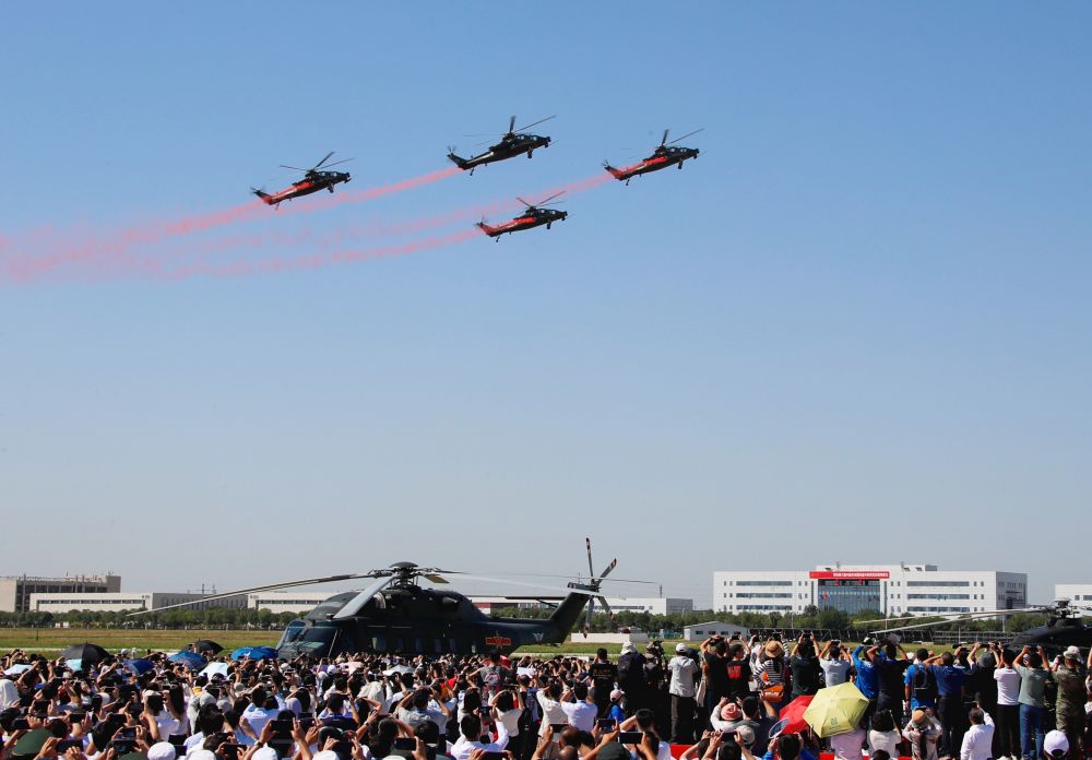 ↑9月14日,在第六届中国天津国际直升机博览会开幕式上,陆军“风雷”飞行表演队直-19武装直升机进行飞行表演。新华社发(陈凯 摄)
