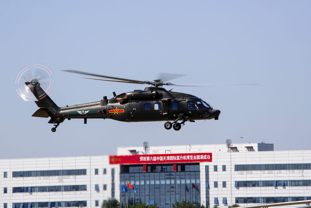 ↑9月14日,在第六届中国天津国际直升机博览会开幕式上,陆军“风雷”飞行表演队直-20战术通用直升机进行飞行表演。新华社发(陈凯 摄)