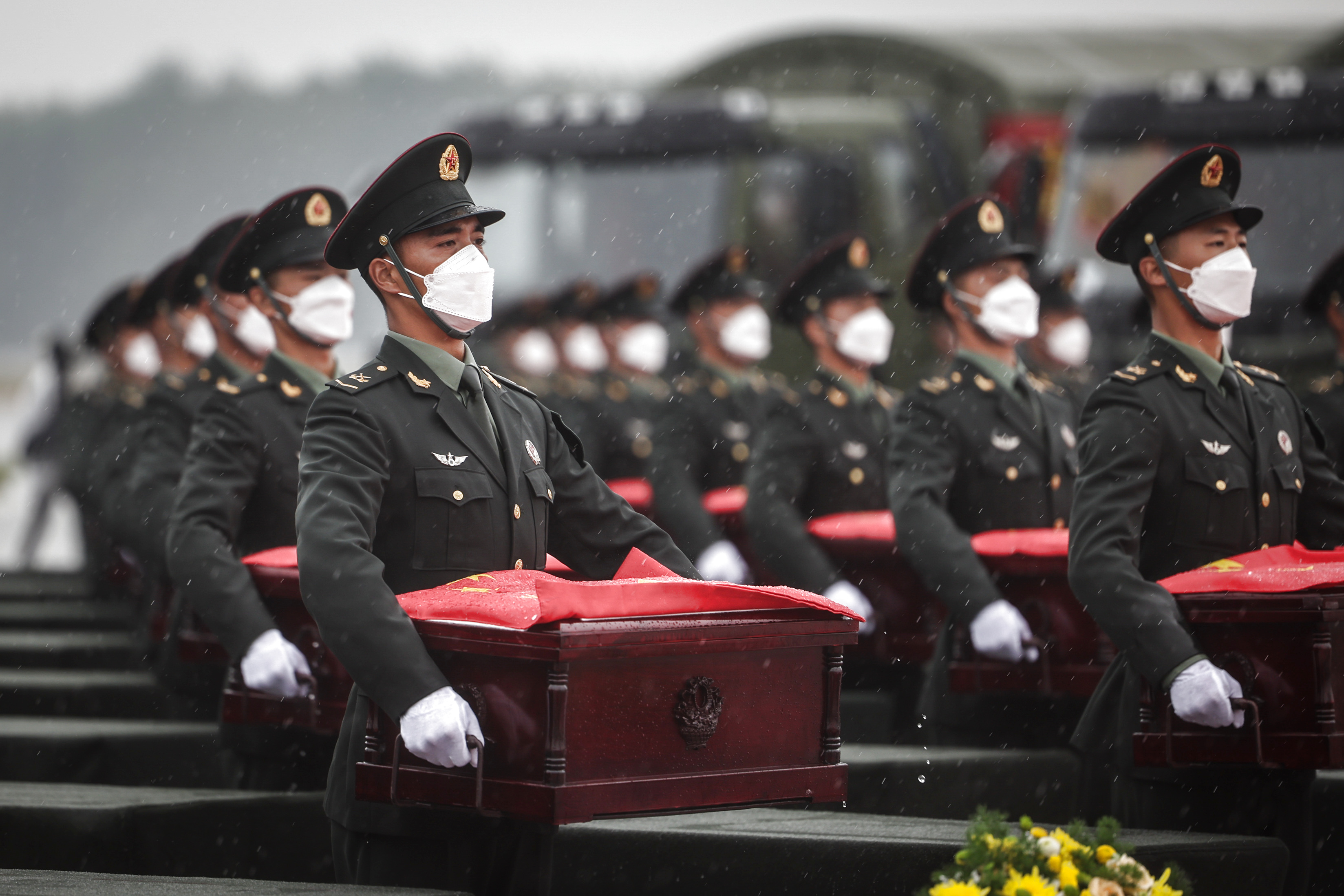 北京时间上午8时35分,中韩双方在韩国仁川国际机场举行志愿军烈士遗骸交接仪式。上午11时5分,空军专机雨中缓缓降落在辽宁沈阳桃仙国际机场。专机进入中国领空后,空军两架战斗机护航,向志愿军烈士致以崇高敬意,沈阳桃仙国际机场以“过水门”最高礼遇迎接志愿军烈士回家。