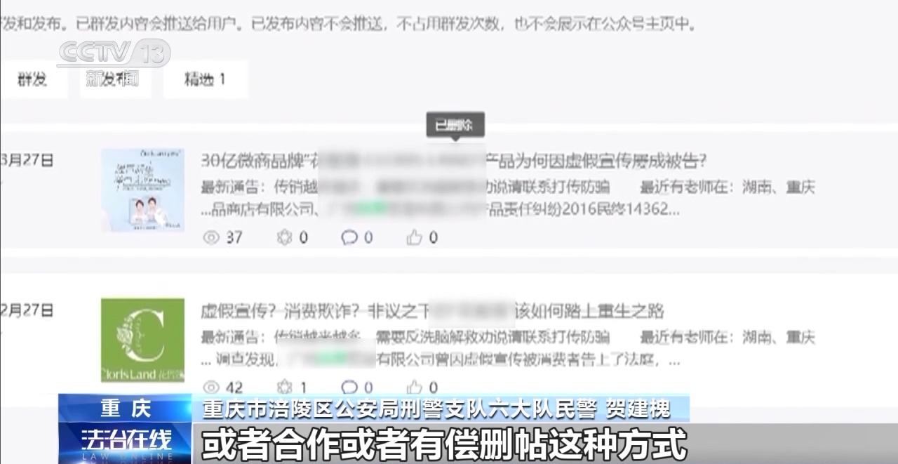 重庆市涪陵区公安局刑警支队六大队民警 贺建槐:这些人一看到黄某某发表了负面文章,就迅速扩散,并且他们反传销圈的相关人员也会积极进行造势,给企业形成了很大的舆论压力。企业在迫不得已的情况下,会通过反传销圈其他人员或者主动联系黄某某,去解决问题。只要企业主动联系黄某某,黄某某就会通过合作或者有偿删帖方式,变相对企业进行敲诈勒索。