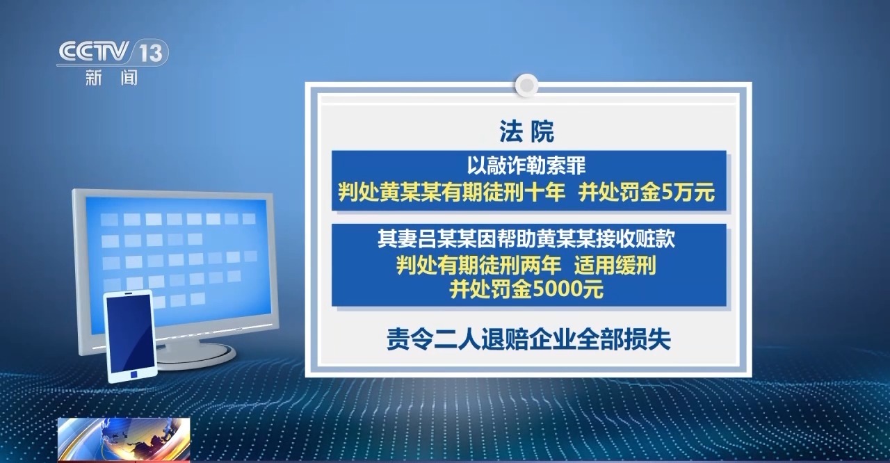 今年3月,重庆市涪陵区人民法院依法开庭审理了此案,以敲诈勒索罪判处黄某某有期徒刑十年,并处罚金5万元。其妻吕某某因帮助黄某某接收赃款,被判处有期徒刑两年,适用缓刑,并处罚金5000元。同时法院责令二人退赔企业全部损失。