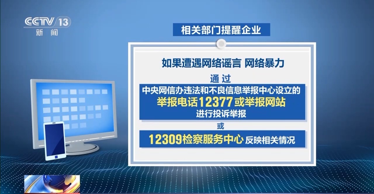 同时,相关部门也提醒企业,如果遭遇网络谣言、网络暴力,可以通过中央网信办违法和不良信息举报中心设立的举报电话12377或举报网站进行投诉举报,或通过12309检察服务中心反映相关情况。