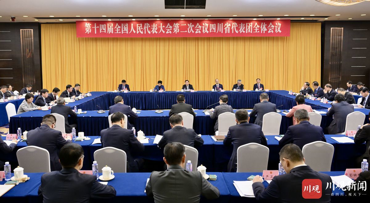 3月11日上午,出席十四届全国人大二次会议的四川代表团在驻地举行全体会议。省委书记、省人大常委会主任、代表团团长王晓晖主持会议并讲话。省委副书记、省长、代表团副团长黄强,省委副书记、成都市委书记、代表团副团长施小琳参加。