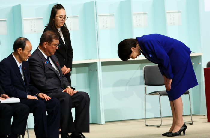 10月4日,在日本东京的自民党总部,高市早苗(右一)在自民党总裁选举中胜出后鞠躬致意。新华社发(Pool图片,金敬勋摄)