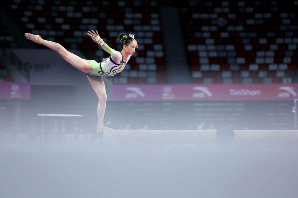 ↑4月13日,浙江特美赢杯体操队选手张清颖在女子个人全能平衡木比赛中。最终她以104.165分的总成绩获得第三名。 新华社记者 沈伯韩 摄