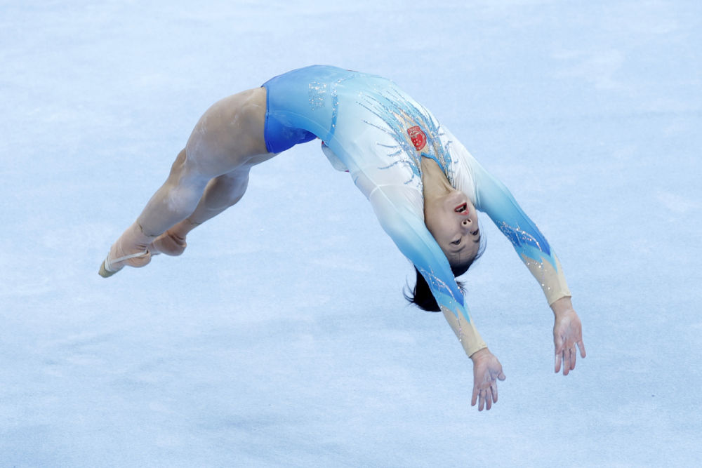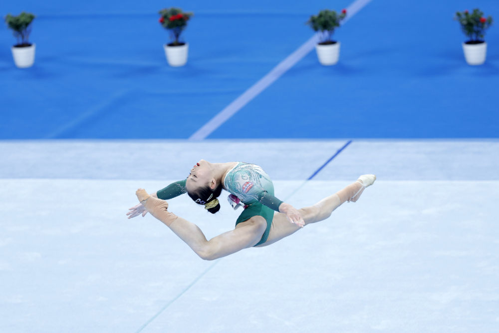 ↑4月13日,浙江特美赢杯体操队选手张清颖在女子个人全能自由操比赛中。最终她以104.165分的总成绩获得第三名。 新华社记者 沈伯韩 摄