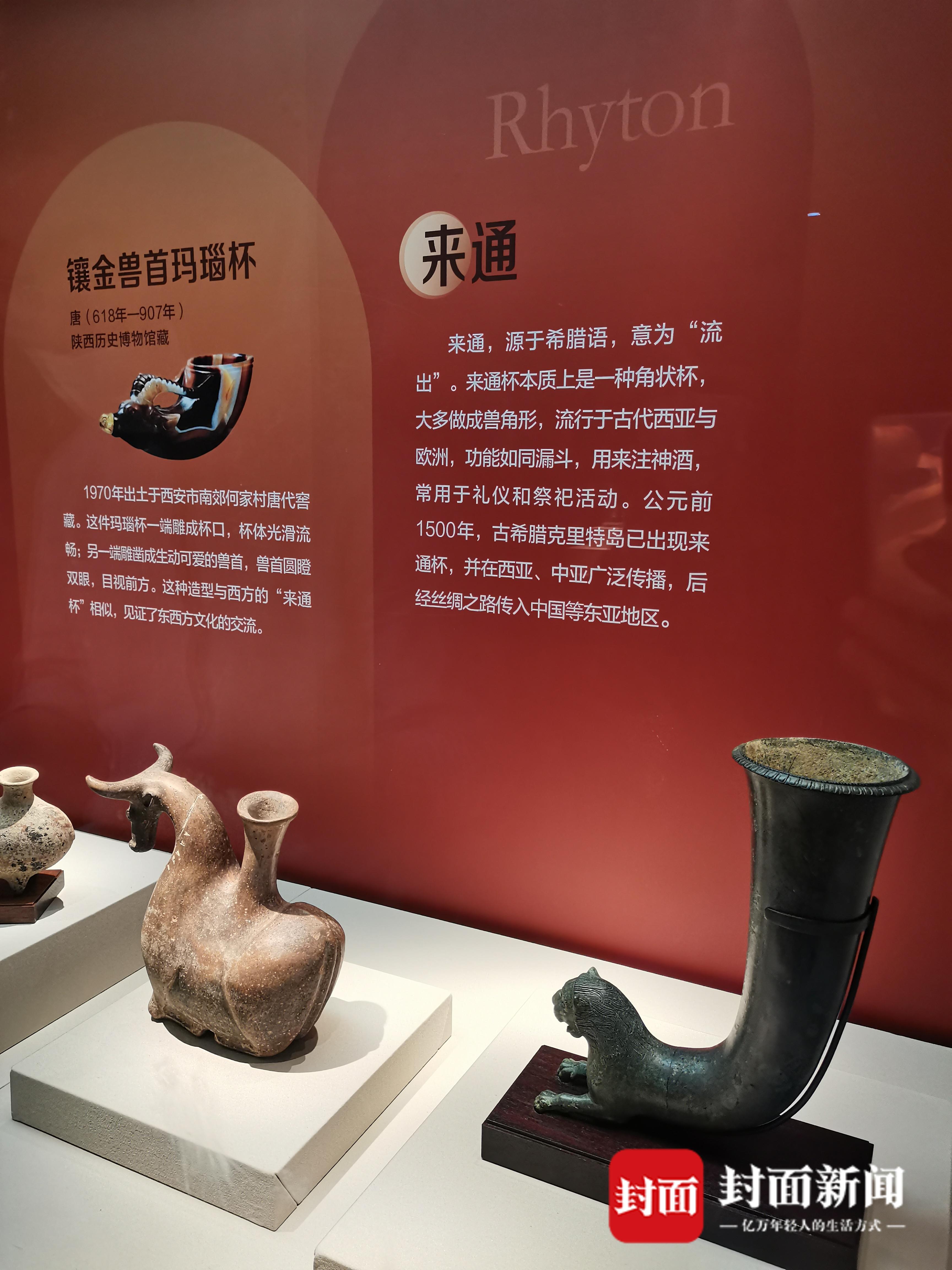 “来通”(Rhyton)一词源自古希腊语,意为“流动”或“流出”。在宗教仪式、宴会庆典等重要场合,来通常作为酒器使用。大约在公元3-4世纪,来通传入中国,在中国唐代较为流行,如陕西西安何家村出土的唐代兽首玛瑙杯、四川大学博物馆收藏的唐代邛窑胡人抱角杯等,都是来通杯中的精品。