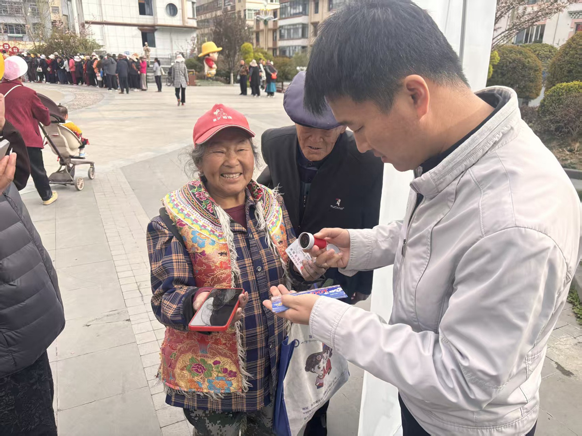 图为姜南(右一)正在金川县城参与消费券发放工作