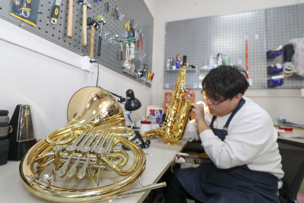 二次方二手商品流通电商产业园内,工作人员在维修二手乐器。新华社发