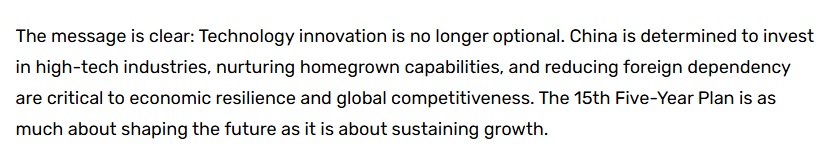 文章说,去年通过的“十五五”规划建议,勾勒出宏大的发展目标:更高质量的增长、更强大的金融体系,以及持续扩大的内需。其中,科技创新是中国战略的核心。这份建议中多次提及科技自立自强,这表明中国不仅将其视为目标,更视其为未来增长的核心引擎。