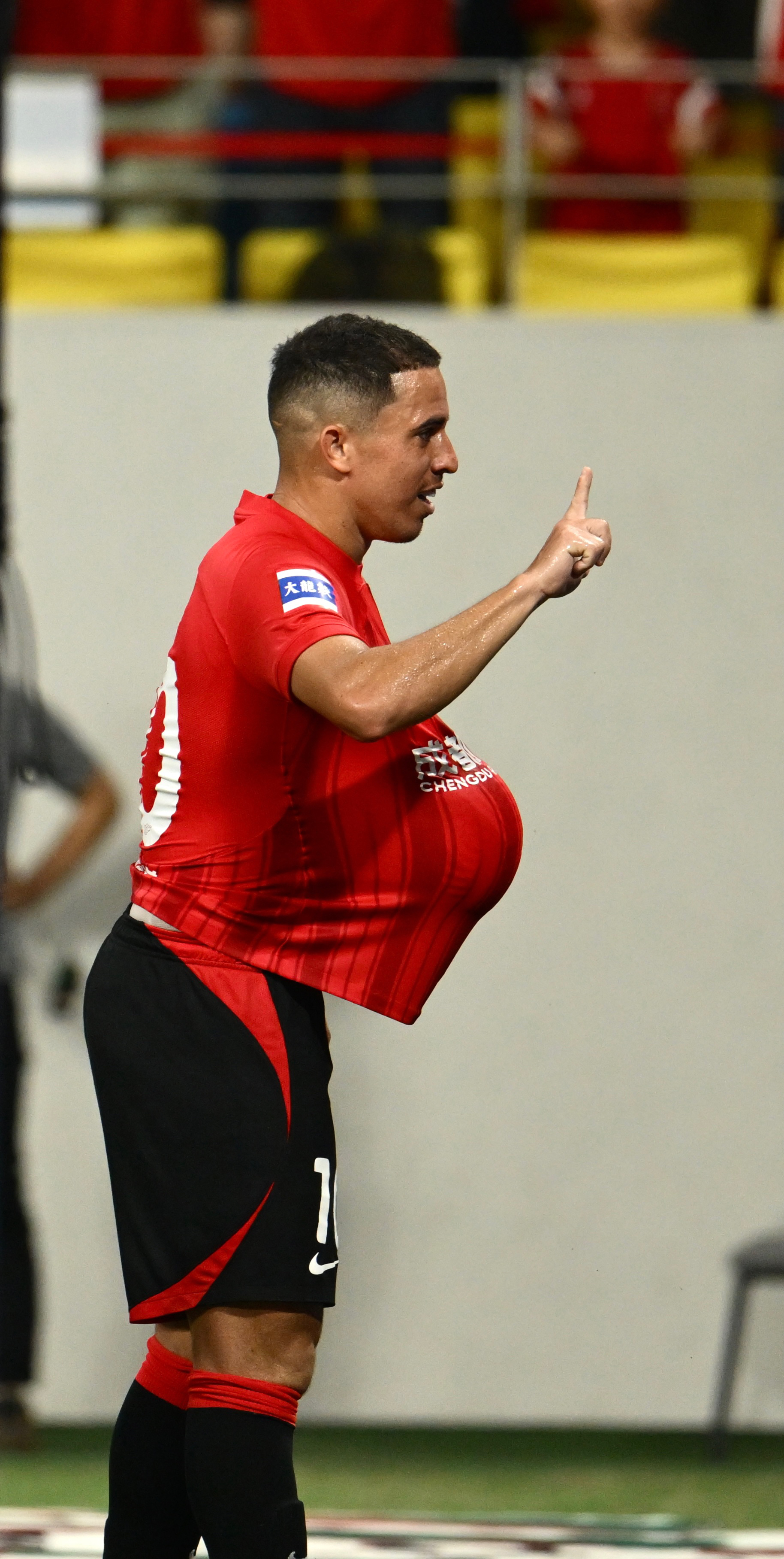 比赛第83分钟,成都蓉城再次扩大比分,费利佩传球到中路,罗慕洛禁区前停球后,突然发力低射破门,4:0!进球后的罗慕洛将皮球塞到球衣里,模仿怀孕的妻子,把这粒进球献给即将出生的孩子。