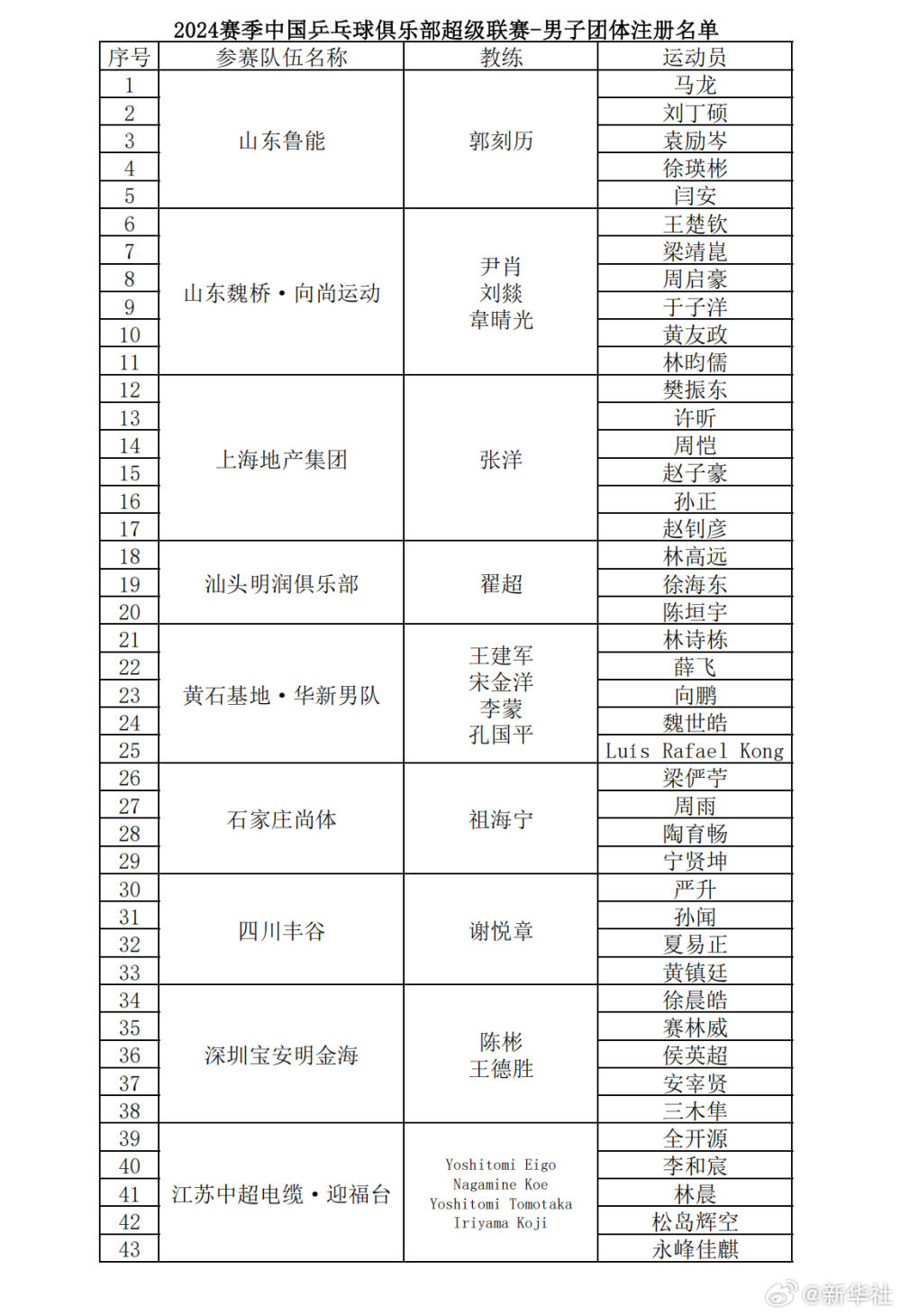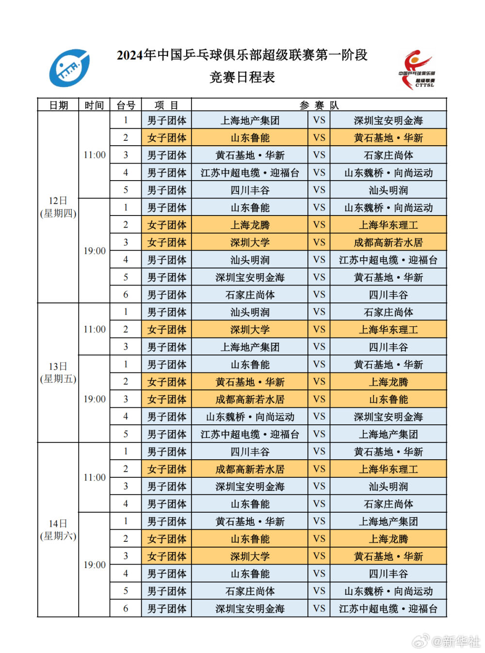 12日至16日,2024赛季中国乒乓球俱乐部超级联赛第一阶段比赛将在湖南长沙举行。各参赛俱乐部的运动员注册名单,以及12日至14日的竞赛日程已经确定。经过单循环对决,男女团体排名前四的俱乐部将晋级总决赛。期待王楚钦、樊振东、林诗栋、孙颖莎、王曼昱等运动员的精彩表现!(记者:谭畅)