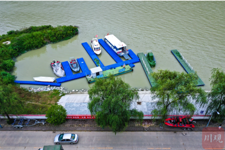 秋高气爽,江河滔滔。9月4日,大渡河畔。作为水运应急码头项目,雅安市石棉县新民乡海耳码头建成投用,蓝色浮筒搭建起水上平台,数艘客渡船平静地停靠在岸边。