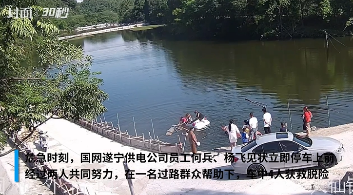 8月1日下午4点,四川遂宁市射洪市天仙镇到双庙村的三叉路口,一辆轿车失控,撞断护栏,滑坠入一旁的水库中。正前往双庙处理故障报修的国网遂宁供电公司天仙供电所员工何兵、杨飞见状立即停车上前施救。何兵脱下衣裤跳入水中,杨飞不会游泳则找来施工木板和树干抛向水中。经过两人共同努力,在一名过路群众帮助下,落水被困的4人获救脱险。
