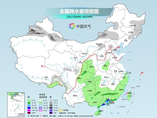 昨天,江南、华南等地雨水持续,局地出现弱雷暴,夜间起降水明显减弱。监测显示,24日8时至25日6时,新疆北部、黑龙江西北部、西藏东部等地部分地区出现小到中雪或雨夹雪,局地大雪;湖南东南部、广西东北部、福建南部等地部分地区出现中雨,局地大雨。