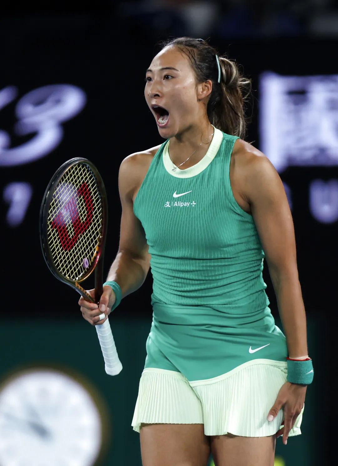 1月25日,郑钦文在比赛中庆祝得分。新华社记者 马平 摄