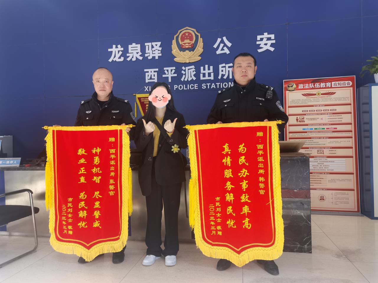 此时,刘女士终于意识到自己被骗了,立即来到成都市公安局龙泉驿区分局西平派出所报警求助。经过民警工作,及时为刘女士追回钱款,避免了损失,收到退款的刘女士为办案民警送来锦旗表达感谢。