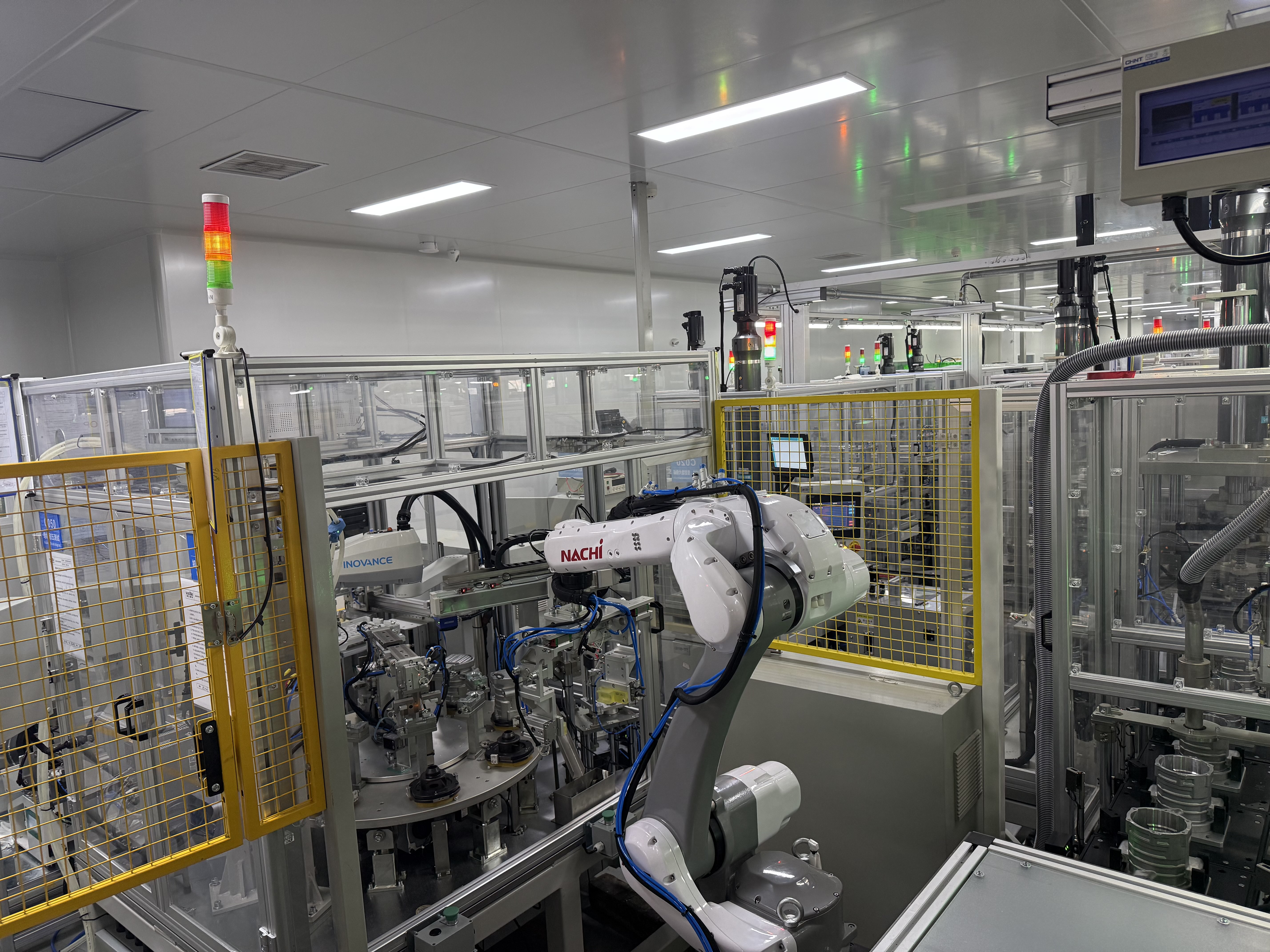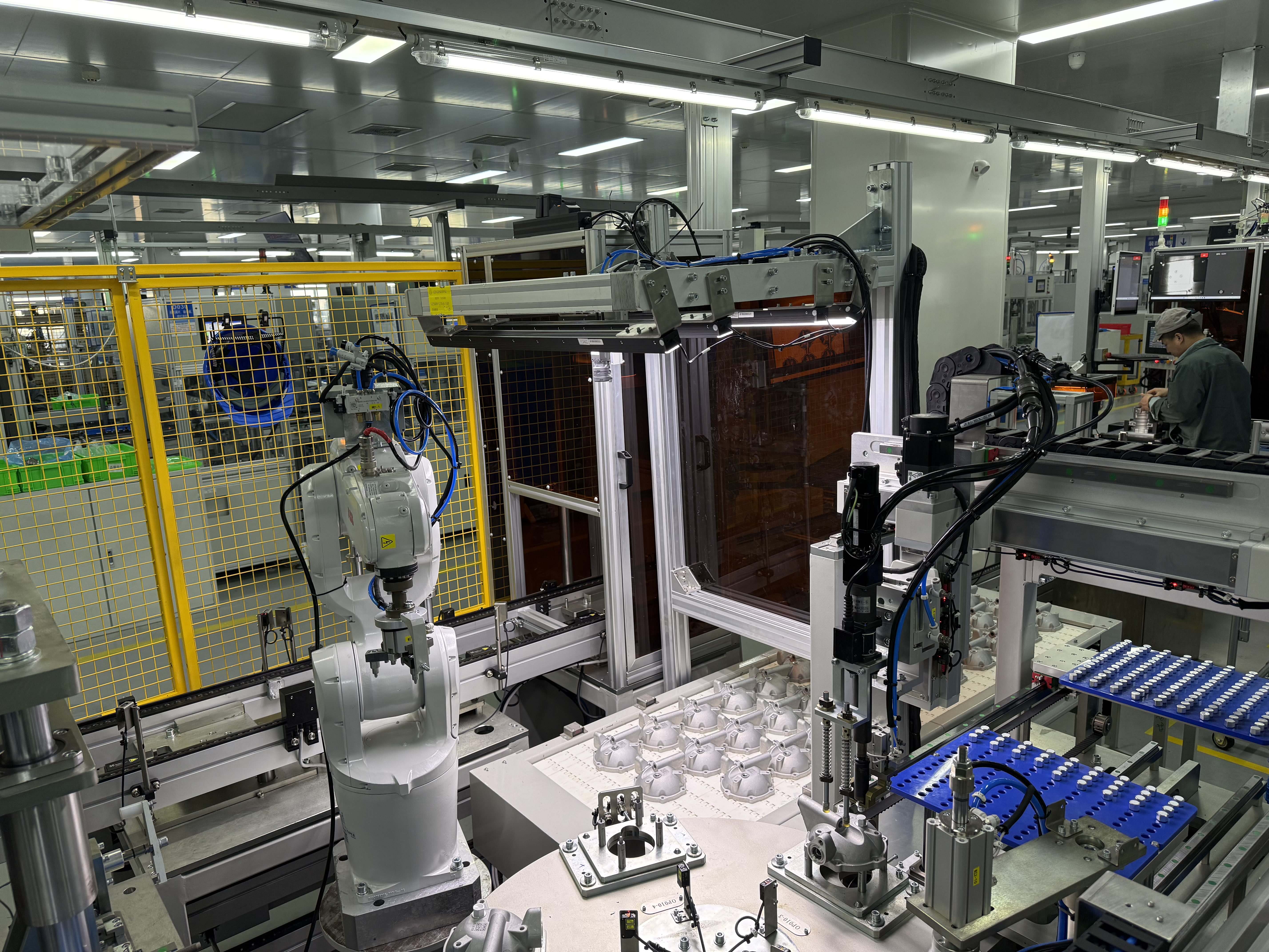 仔细观察,一道道工序中藏着“智造”巧思,共同支撑起了产线高效率、高品质的运转。在三针装配工序,只见机器人自动上下料,三针自动化装配,再配备视觉、红外等传感器,实现了装配的稳定性与防差错;在主轴承压装工序,采用伺服压机、曲线监控,保证了压装高度的一致性;再看动盘,定盘分选、装配工序,同样采用了机器人自动上下料,测量精度可达1um,保证了压缩机的性能;在外观检查环节,利用AI视觉相机对压缩机外观、标签等进行检查,实现产品高质量下线……