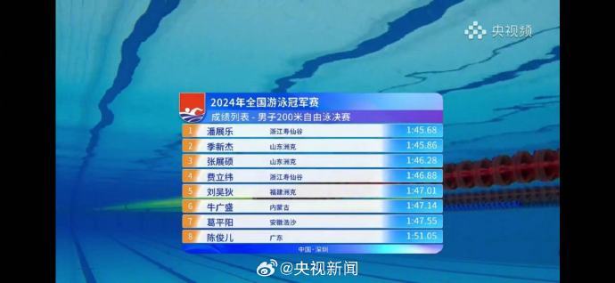 祝贺!潘展乐夺全国游泳冠军赛男子200米自由泳冠军 央视新闻客户端 2024-04-21 21:57 53805 2024年全国游泳冠军赛男子200米自由泳决赛中,潘展乐以1:45.68的成绩获得冠军。祝贺! 评论 12 王美好 2024-04-22 发表于四川 刷新纪录指日可待,看好你哦! 孟小小 2024-04-22 发表于四川 游得像鱼一样,冠军实至名归! 世界烦扰 2024-04-22 发表于四川 真是少年英雄,期待更多佳绩! 查看更多