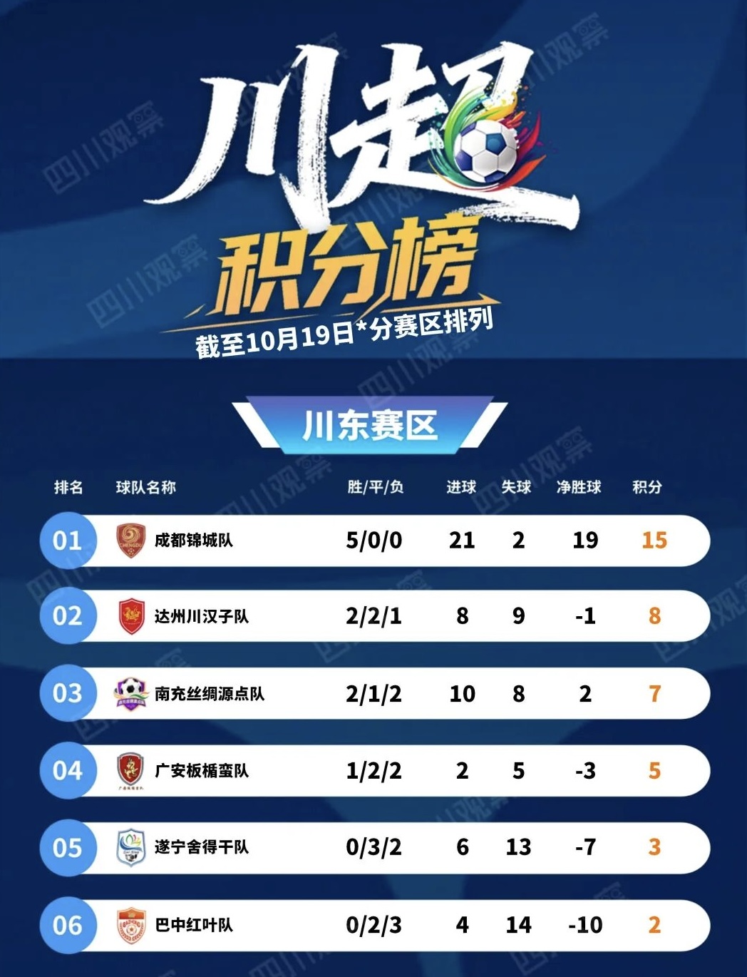 10月19日晚,川超川东赛区积分图。图据四川观察