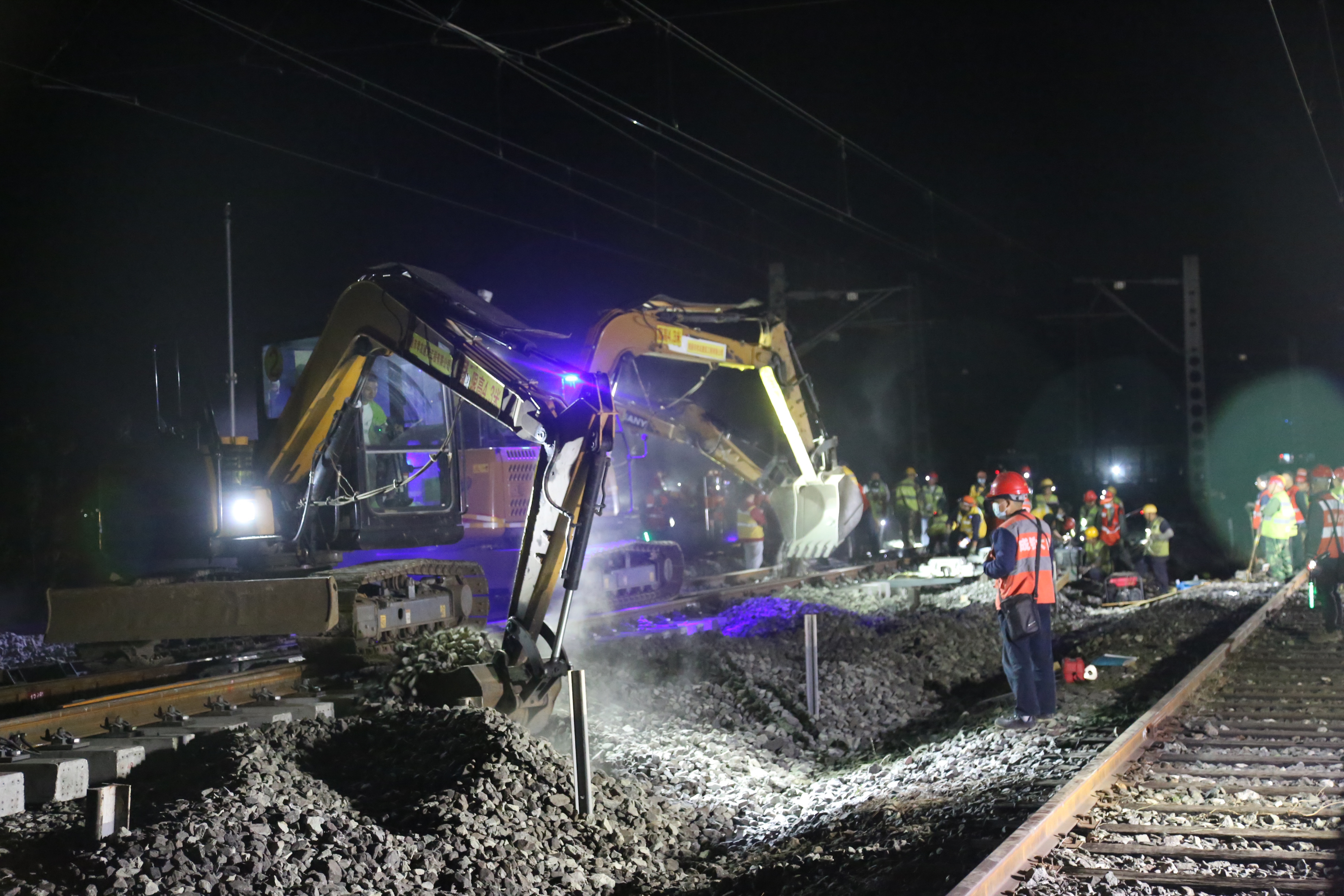 11月3日深夜,首次“天窗”施工开启。道岔的扣件拆除后,撬轨组人员立即将钢轨撬出承轨槽;同时,挖掘机进场,协助移除旧道岔钢件。