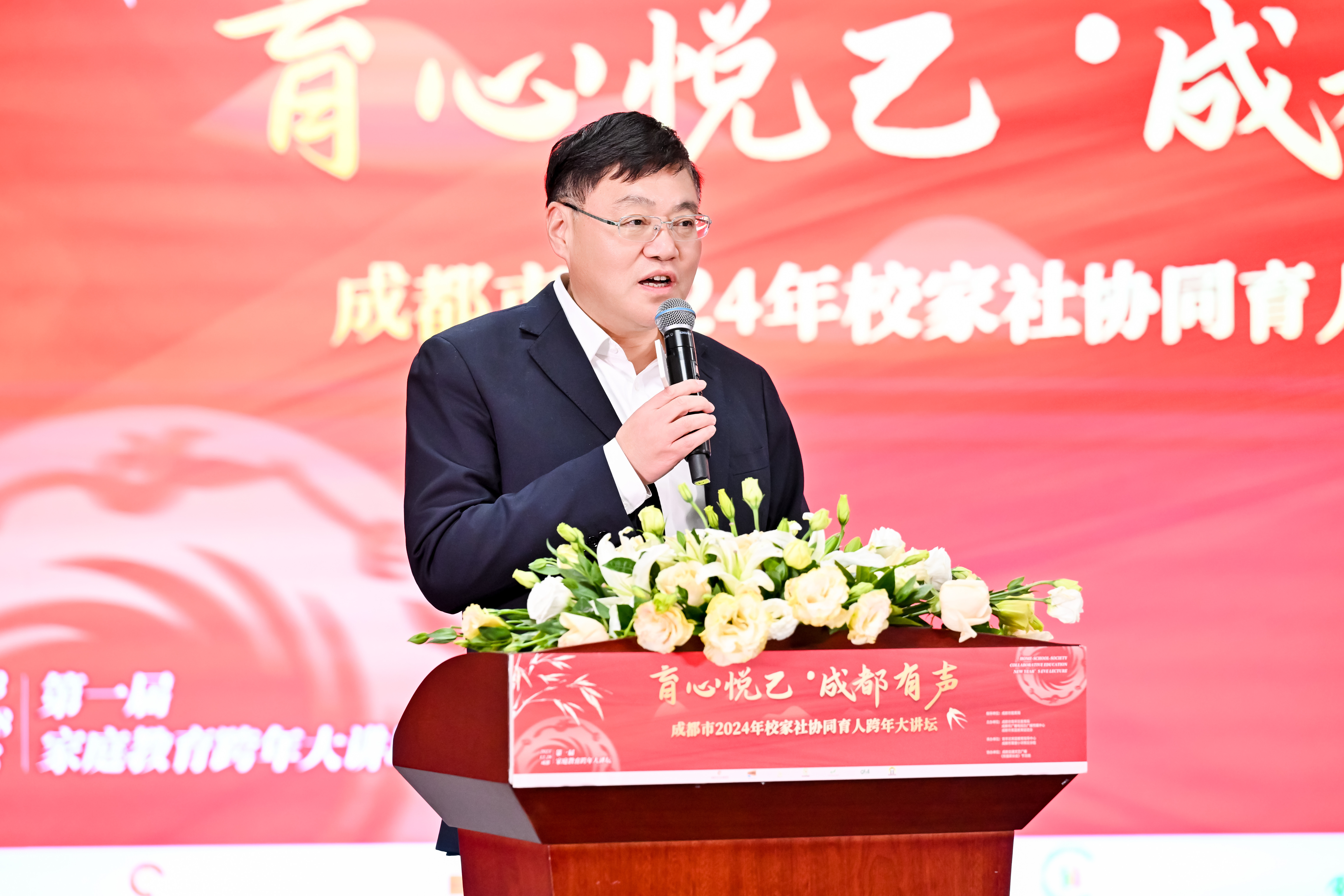 中共四川省委教育工委副书记、省教育厅党组成员、副厅长、一级巡视员崔昌宏致辞,就学校、家庭和社会三方合作关系发言,他强调家庭作为学生的主要成长环境,应发挥主导作用;学校则需发挥协同作用,与社会共同构建教育共同体。同时,他也指出,从某种意义上讲,家庭是学生成长的第一课堂,家长承担着至关重要的教育职责。因此,在培养学生全面发展的过程中,家庭、学校和社会应紧密合作,形成教育合力,共同为学生创造良好的成长环境。