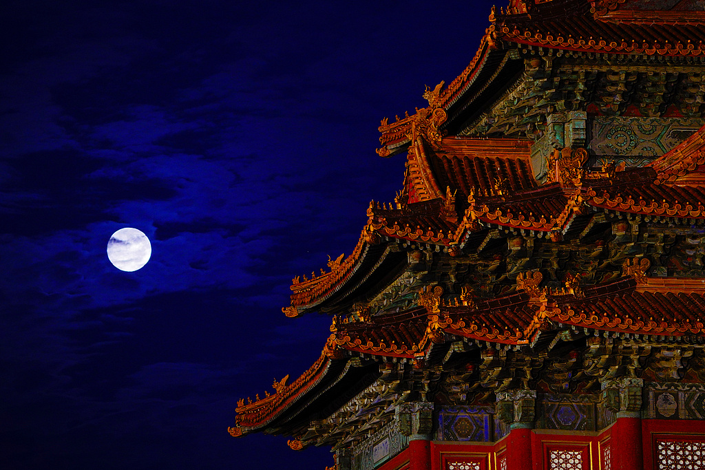 北京,夜幕降临,一轮圆月现身夜空,偶有彩云相伴。圆月与故宫角楼、角楼脊兽同框,仿佛穿越古今。